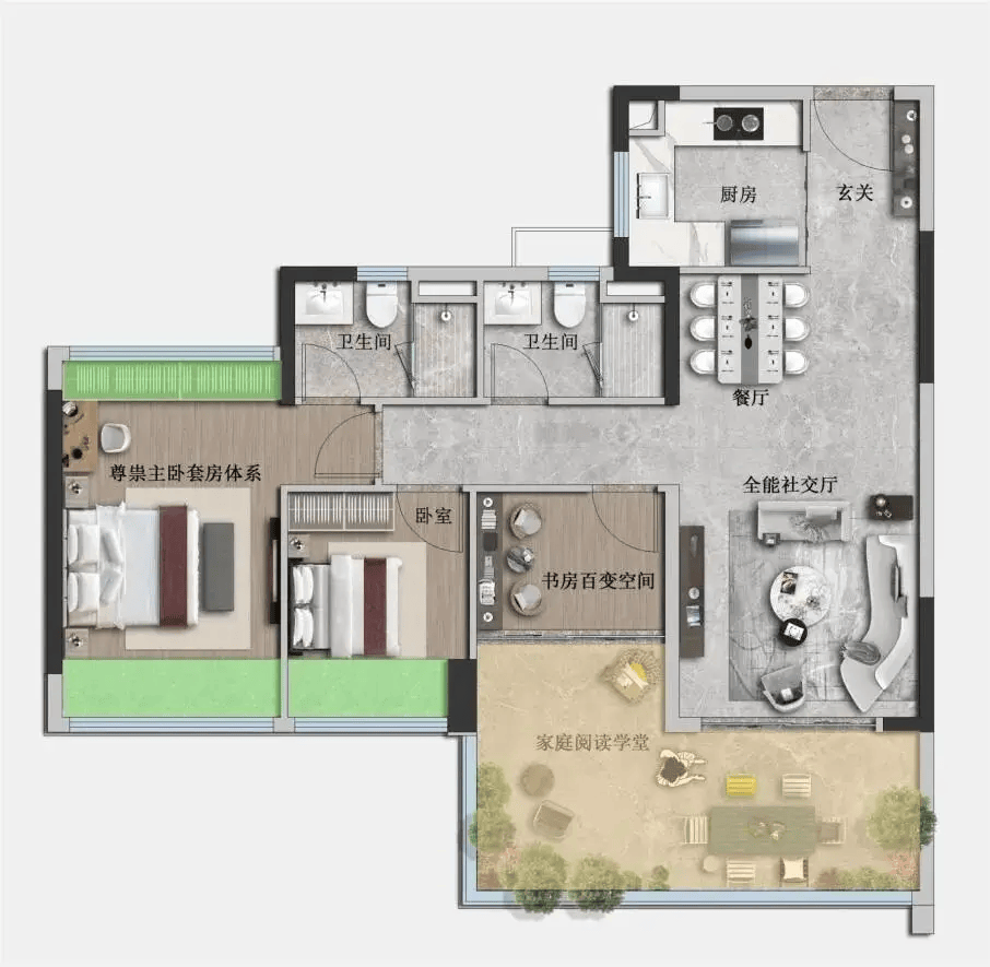 所有户型均配备全景飘窗、阔景阳台,部分户型实现主卧套房设计,配备独立卫浴与衣帽间;厨房采用 U 型布局,预留双开门冰箱位置,实用性强;同时预留智能家居接口,支持智能门锁、智能照明、智能安防等系统安装,适配现代智慧生活需求。
