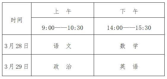 三、考试科目:语文、数学、政治、英语;考试分值:每科150分,总分600分,使用国家通用语言文字作答。